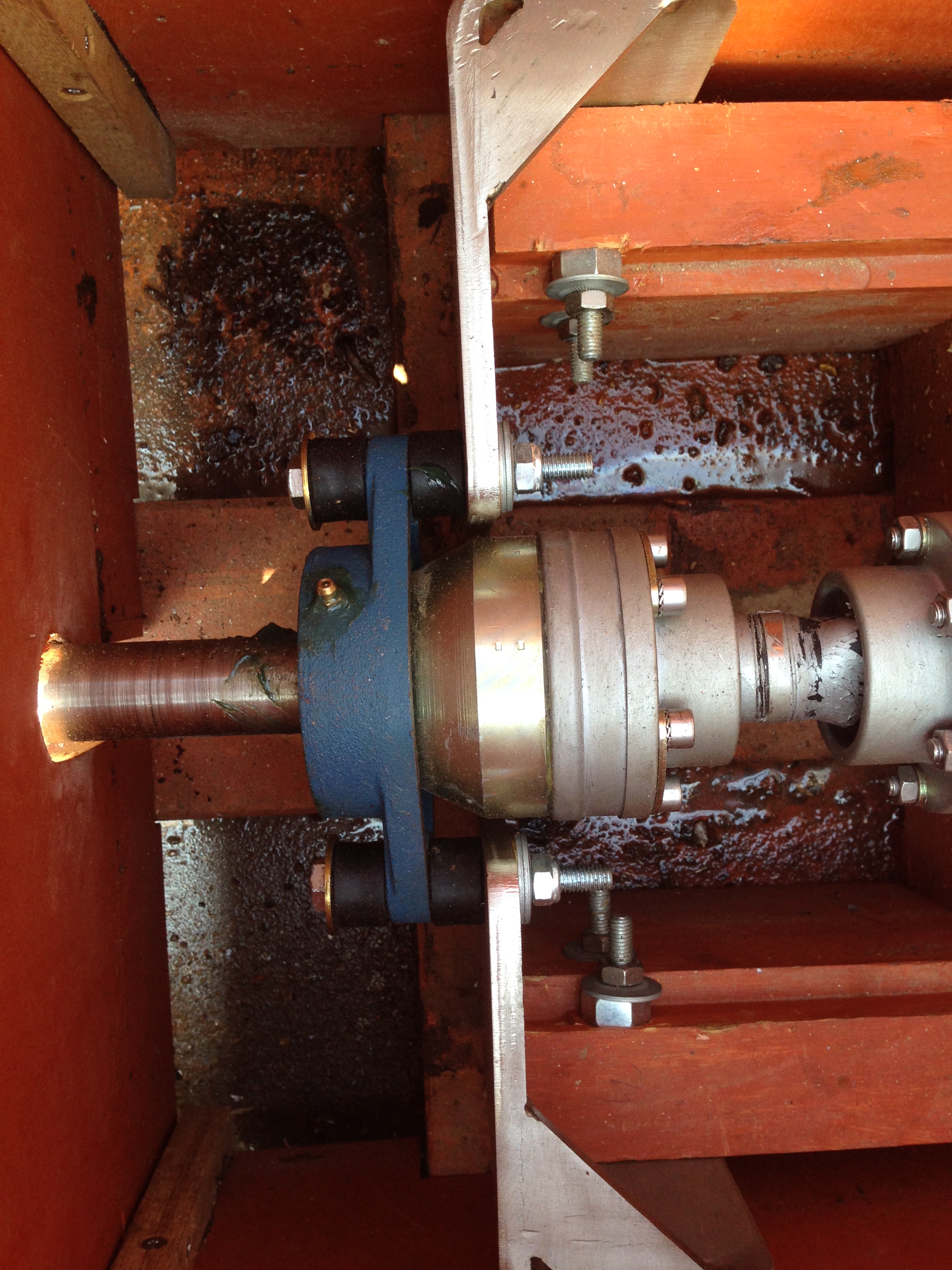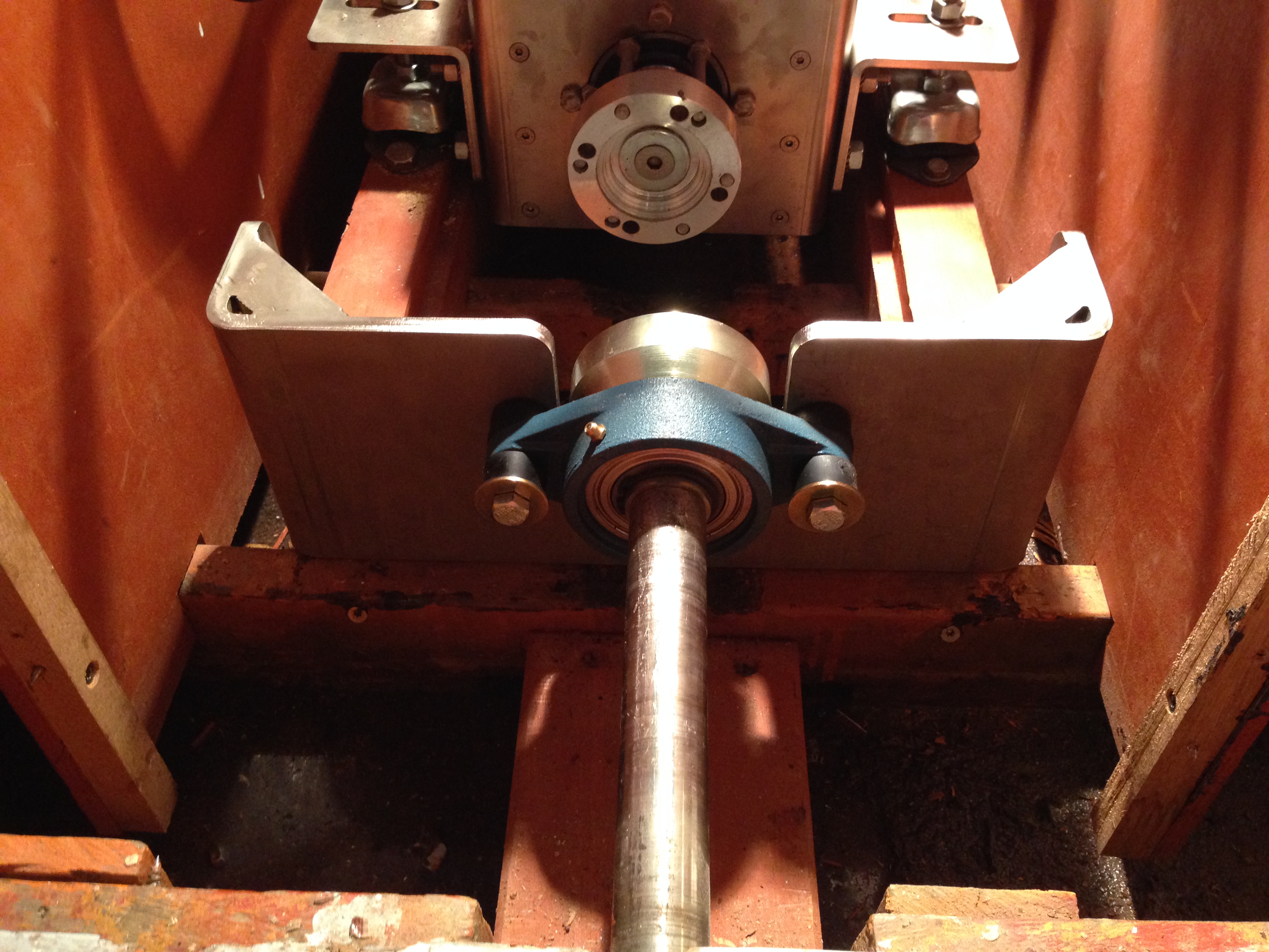 Le plus délicat fut ensuite l’installation du palier de buté ; celui-ci est fixé sur une plaque inox de 10mm d’épaisseur découpée pour s’adapter au palier de butée ; cette plaque est elle-même fixée sur les carlingues moteur sur lesquelles elle reporte les efforts de propulsion ; le positionnement vertical et horizontal du palier de buté est important car celui-ci doit être parfaitement aligné avec l’arbre d’hélice.